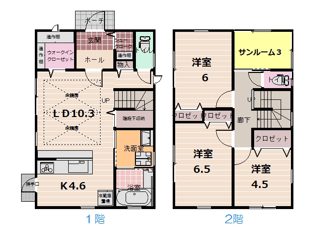LDK14.9畳 1階 洋室6.5畳 2階 洋室6.0畳 2階 洋室4.5畳 2階 その他3畳 2階 サンルーム室 その他2畳 1階 WIC室
